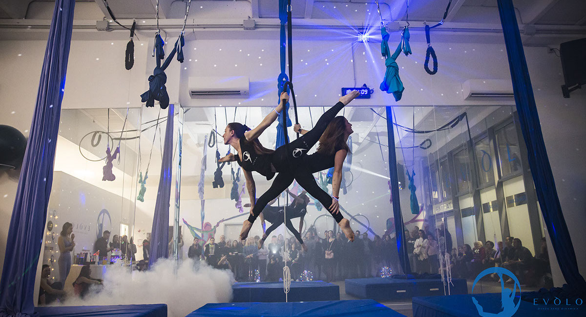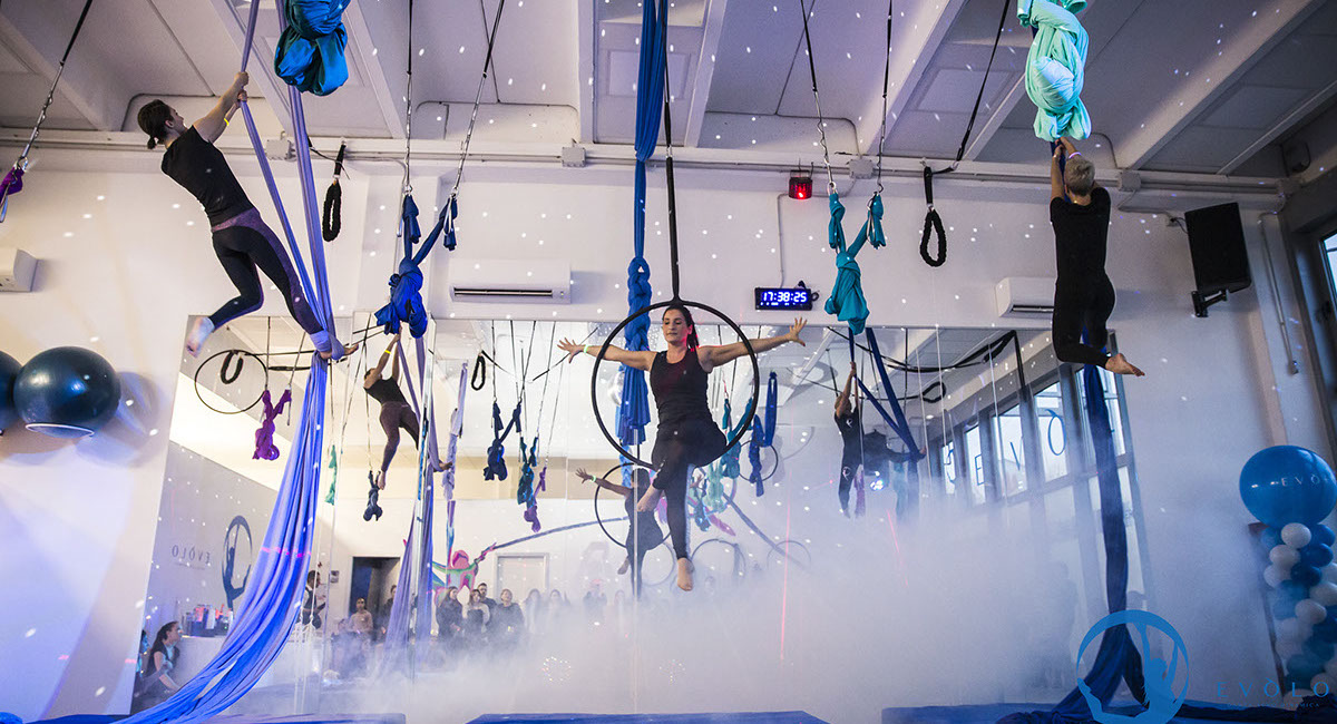 "Evòlo" nasce dal desiderio di far scoprire e appassionare giovani e adulti alle arti acrobatiche aree.